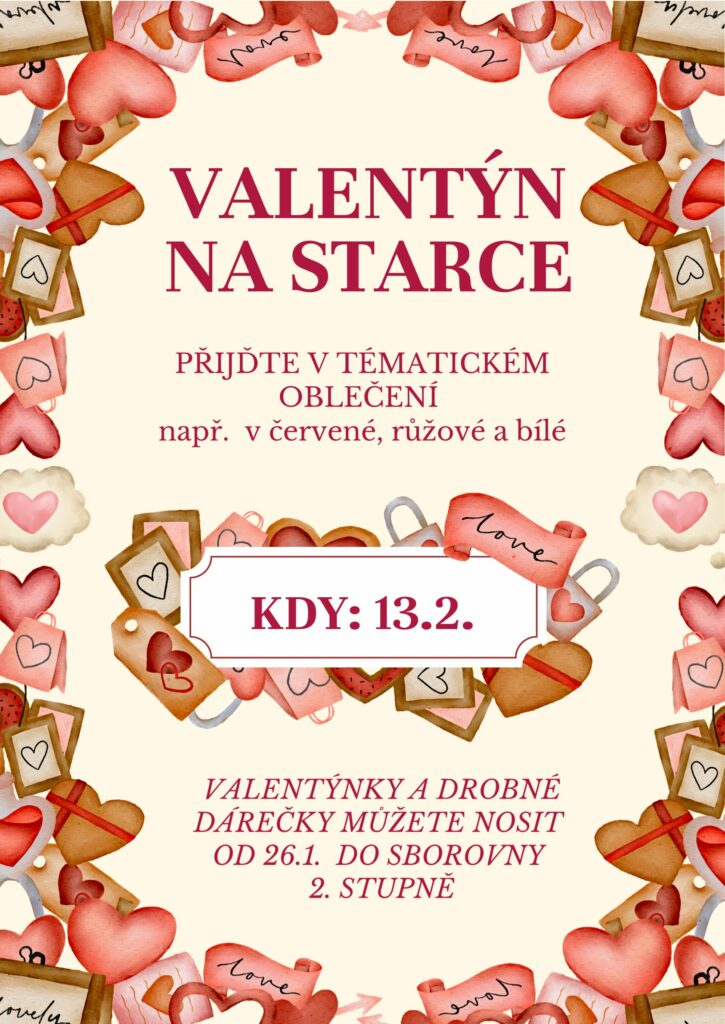 🔔 2. 2. - 6. 2. 2026 Jarní prázdniny 🧡 13. 2. Valentýn na Starce ⏰🔊 12. a 13. 2. Zápis do 1. ročníku