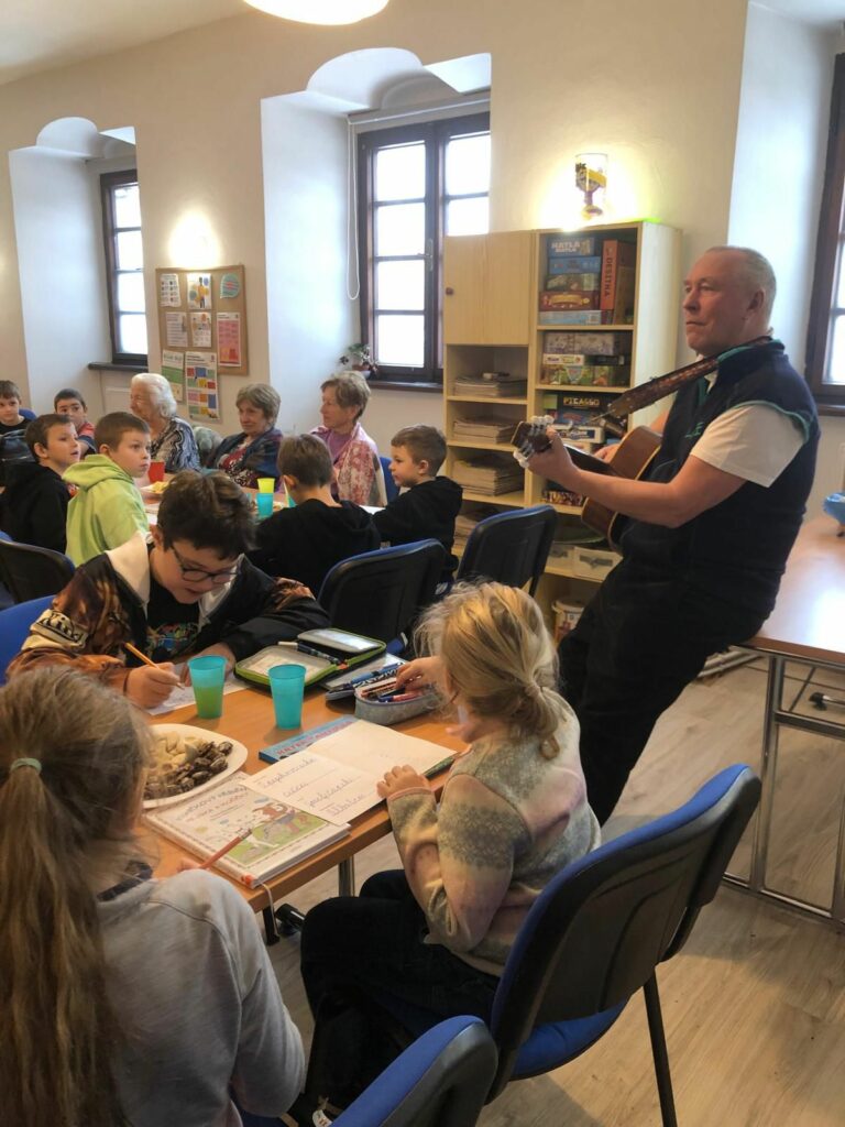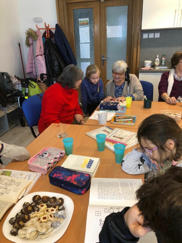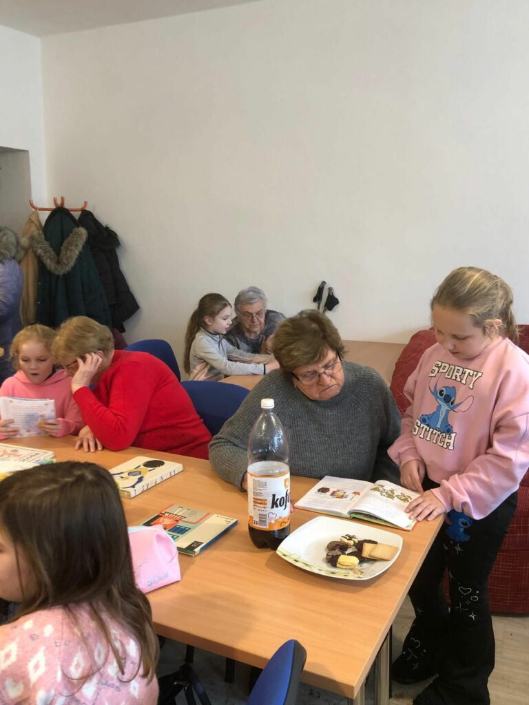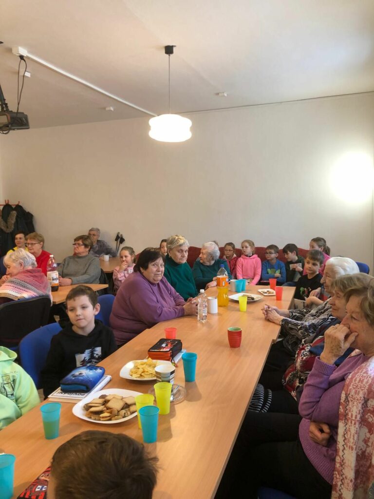 Volba knihy nebyla náhodná – příběh „Jak pejsek s kočičkou vařili dort“ dobře znají obě generace. Děti poté odpovídaly na otázky týkající se děje, aby bylo zřejmé, zda porozuměly textu. Senioři dětem vyprávěli, jaké dorty se pekly u nich doma. Nakonec děti četly seniorům i své vlastní knížky, které si také na setkání přinesly s sebou. Příjemnou atmosféru podpořil i pan Karel Čihák hrou na kytaru a společným zpěvem písniček pro děti.