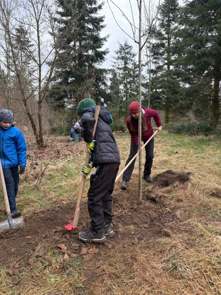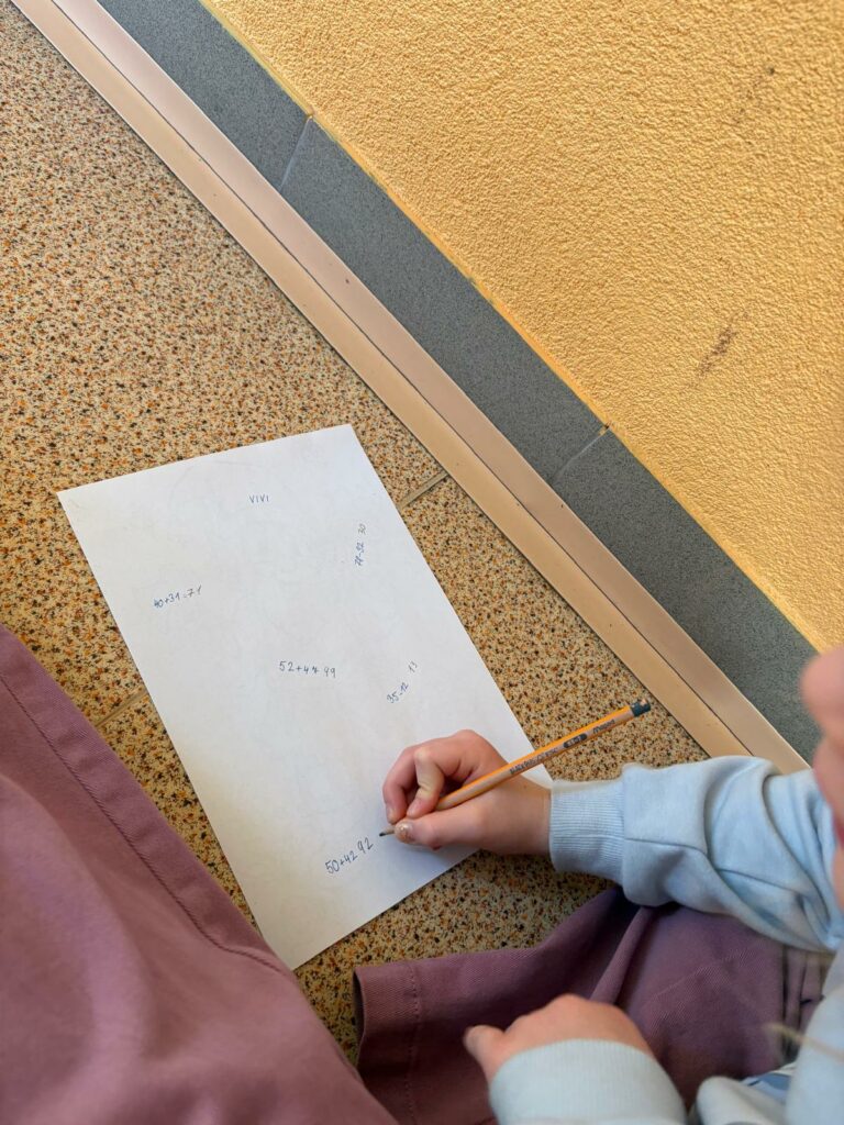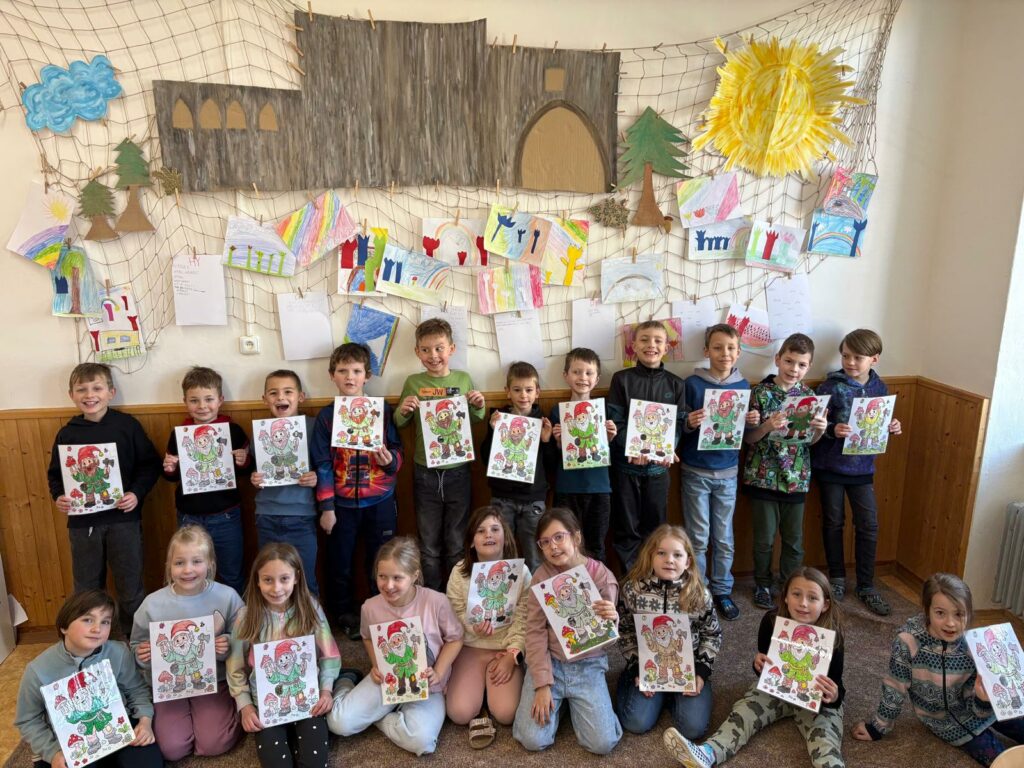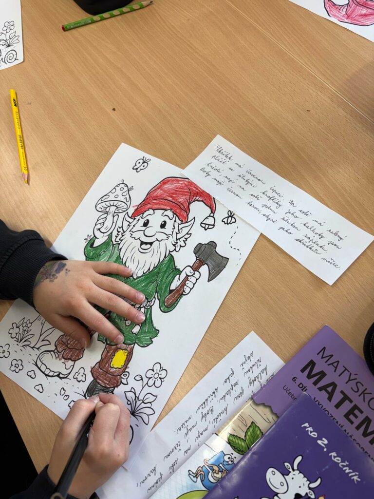 Abychom ale střechu mohli postavit, potřebovali jsme materiál – dřevo a trámy. A protože víme, že nic není zadarmo, rozhodli jsme se jít podobnou cestou jako pohádkoví hrdinové. Začali jsme od úplného základu: sázením stromů. Děti si vyzkoušely práci s půdou a učily se zacházet s různým nářadím. Když jsme „získali“ potřebný materiál, čekal nás další důležitý krok – požádat o pomoc skřítky. Každé dítě se dostalo ke svému skřítkovi pomocí matematických příkladů. Skřítka si poté vybarvily podle zadání. Každý skřítek byl originál a stal se důležitou součástí našeho projektu. Abychom skřítky opravdu přesvědčili, že nám mají pomoci, poprosili jsme je písničkou a tancem. Třída se proměnila v radostné místo plné pohybu, hudby a smíchu – a právě v tu chvíli bylo jasné, že společné úsilí přináší nejen výsledky, ale i krásné zážitky.