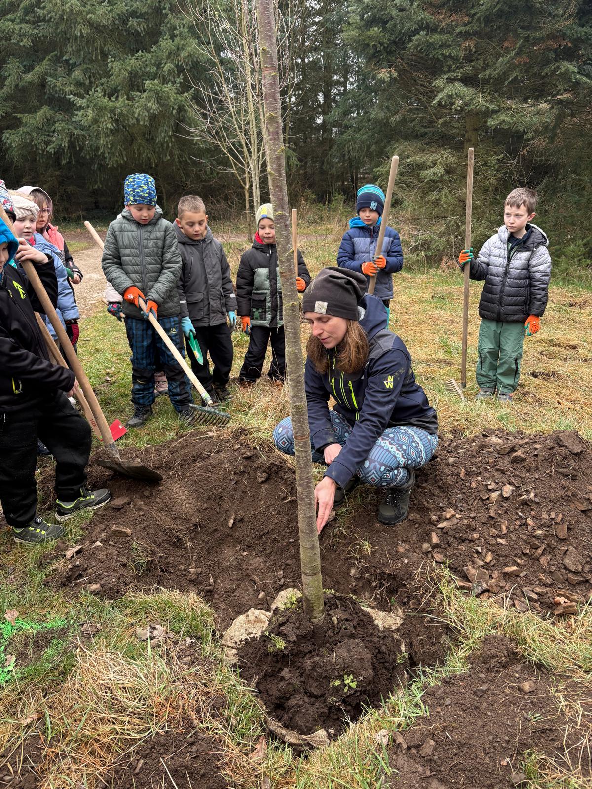Abychom ale střechu mohli postavit, potřebovali jsme materiál – dřevo a trámy. A protože víme, že nic není zadarmo, rozhodli jsme se jít podobnou cestou jako pohádkoví hrdinové. Začali jsme od úplného základu: sázením stromů. Děti si vyzkoušely práci s půdou a učily se zacházet s různým nářadím. Když jsme „získali“ potřebný materiál, čekal nás další důležitý krok – požádat o pomoc skřítky. Každé dítě se dostalo ke svému skřítkovi pomocí matematických příkladů. Skřítka si poté vybarvily podle zadání. Každý skřítek byl originál a stal se důležitou součástí našeho projektu. Abychom skřítky opravdu přesvědčili, že nám mají pomoci, poprosili jsme je písničkou a tancem. Třída se proměnila v radostné místo plné pohybu, hudby a smíchu – a právě v tu chvíli bylo jasné, že společné úsilí přináší nejen výsledky, ale i krásné zážitky.