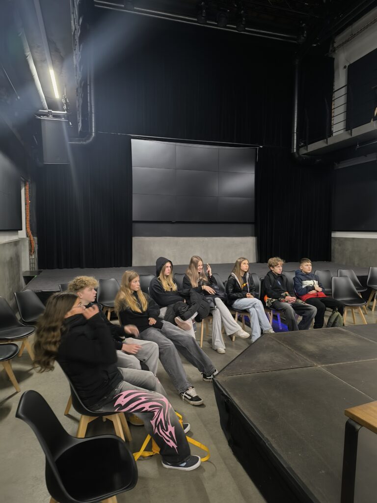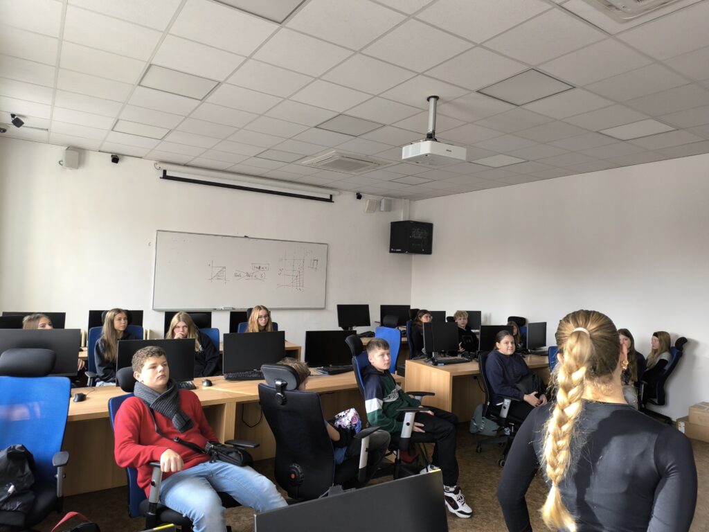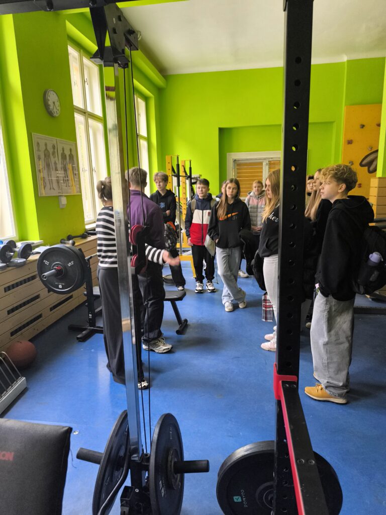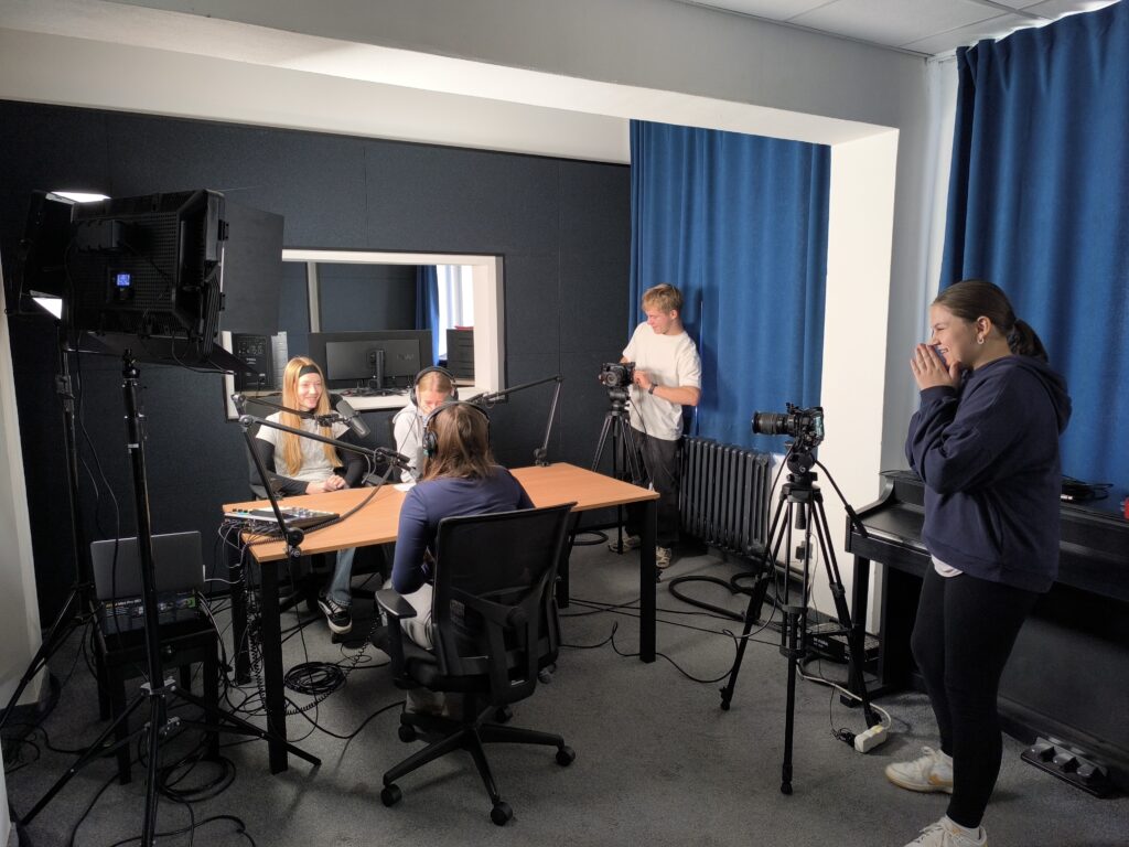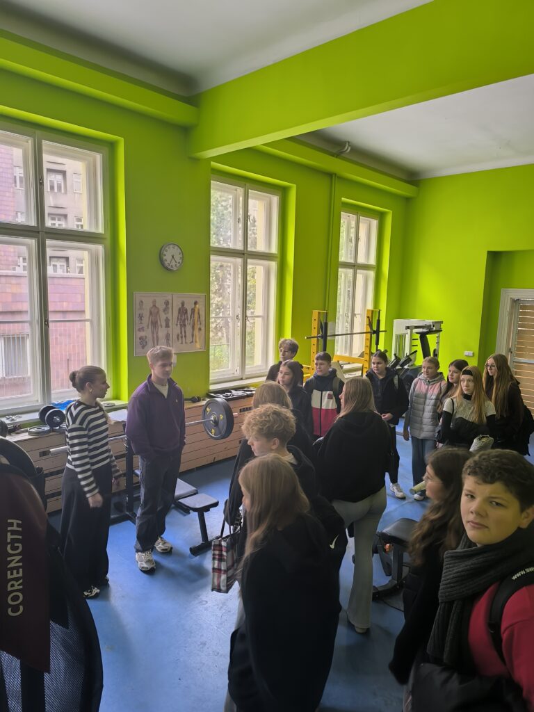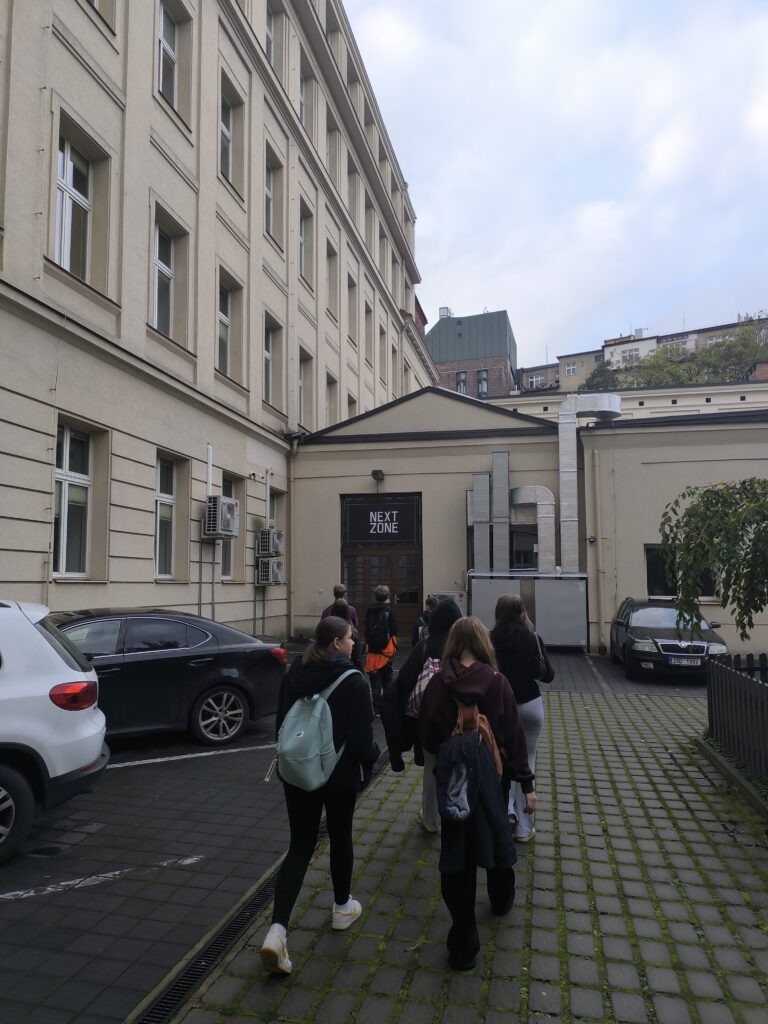 Po příjezdu do areálu školy se nás ujali dva šikovní studenti  – Ondra a Gisele, kteří nás s nadšením provedli celým areálem školy. Ukázali nám učebny s moderním technickým vybavením, školní posilovnu, VR studio i nahrávací studio, kde vzniká školní podcast s názvem ON POINT. Ten si studenti sami připravují, nahrávají i stříhají a zvou si do něj velmi zajímavé hosty z různých oblastí.